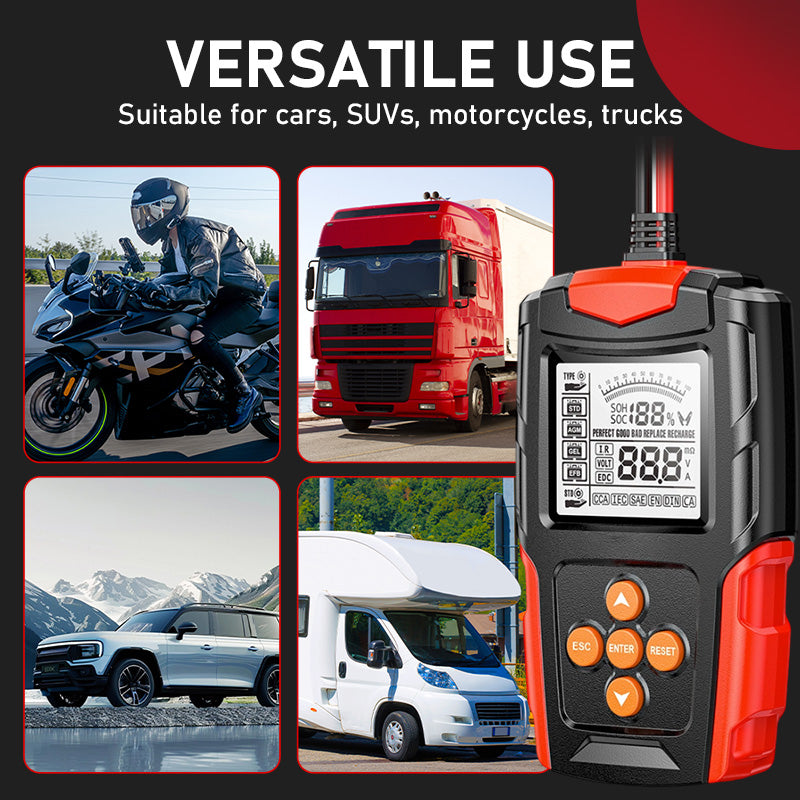 COMPATIBLE WITH MANY VEHICLE BATTERIES - Compatible with 12V and 24V lead-acid batteries, including flooded, AGM, spiral, and GEL types. It’s perfect for cars, motorcycles, and agricultural vehicles, allowing you to test any battery type for optimal performance.