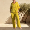 COMFORTABLE COTTON AND LINEN BLEND - Crafted from a premium blend of cotton and linen, this two-piece suit offers the perfect balance of comfort and style. The natural breathability of the fabric ensures all-day comfort, making it ideal for casual outings or lounging at home.