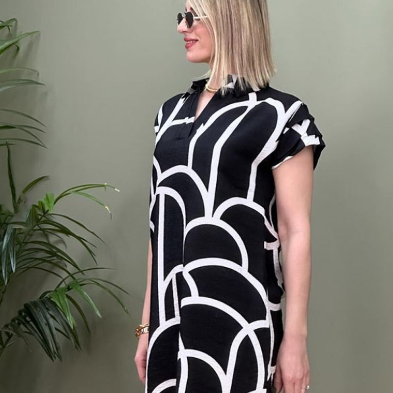 Make a fashion statement with our Chic Geometric Pattern V-Neck Dress. This elegant dress combines classic solid black with an eye-catching irregular geometric pattern, creating a sophisticated and trendy look. The V-neckline adds a touch of femininity, while the short sleeves provide comfort and breathability during the warmer seasons. Designed with two convenient side pockets, this dress offers both style and functionality. Whether you're attending a special occasion or going out for a casual day, this dress is perfect for effortlessly showcasing your unique style.