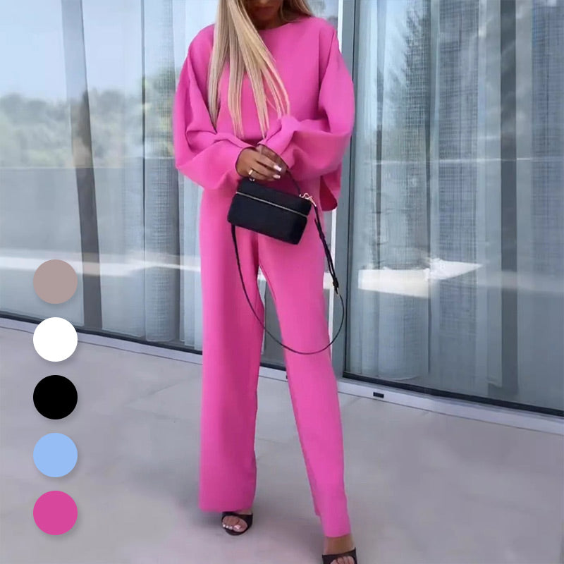 Women's Round Neck Top and Wide Leg Pants 2-Piece Set