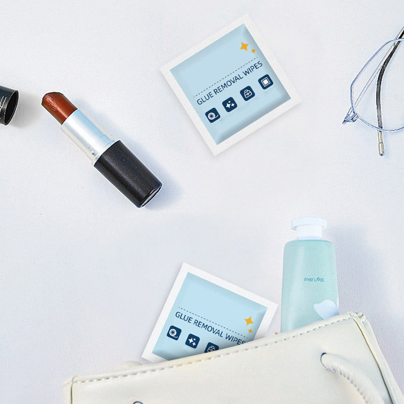 Materials: Non-woven fabric infused with a gentle glue remover solution.