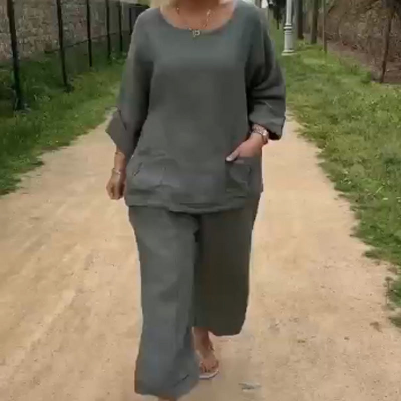 PRACTICAL DETAILS – Both the top and pants feature two spacious pockets each, blending functionality with style. The round neckline offers a classic look, while the long sleeves ensure comfort without sacrificing aesthetics.