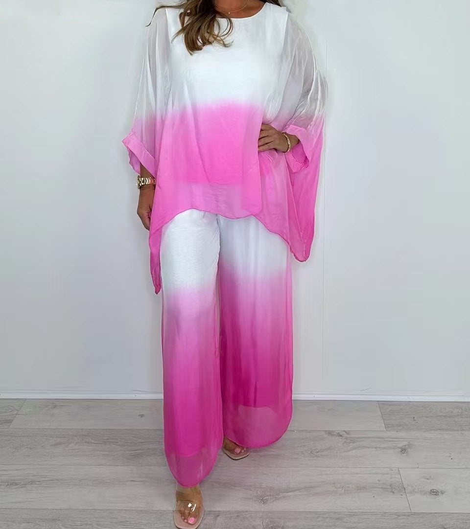 Package Includes:1*Mesh Mix Dip Dye Loose Flowy Top & Trouser Set