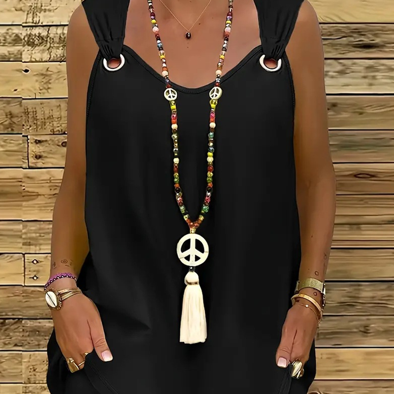 SLEEK SLEEVELESS DESIGN WITH SHOULDER DETAIL: The sleeveless top features a refined V-neckline and distinctive round shoulder rings that add dimension and modern flair. This elevated detail transitions effortlessly from casual daytime wear to evening summer events, offering versatility with a fashion-forward edge.