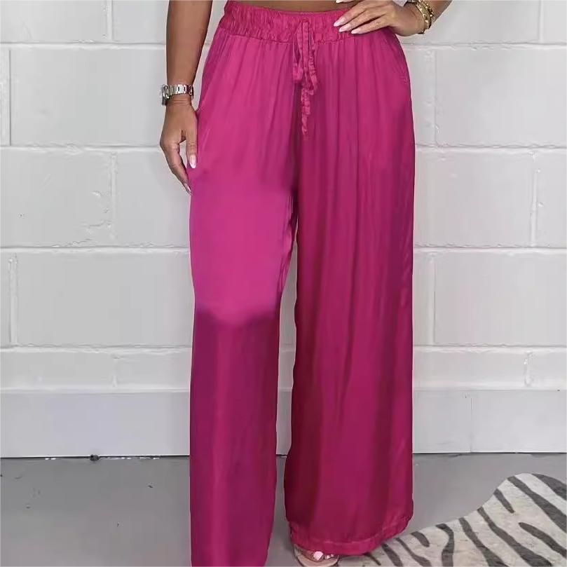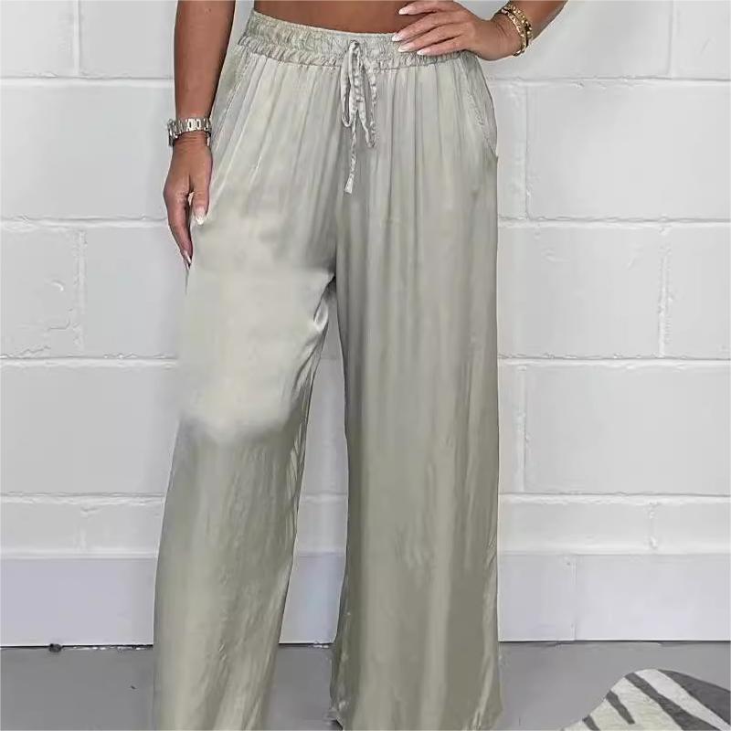 1*Stylish Drawstring Waist Straight Leg Smooth Loose Trousers with Pockets