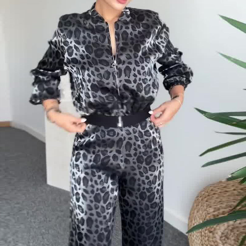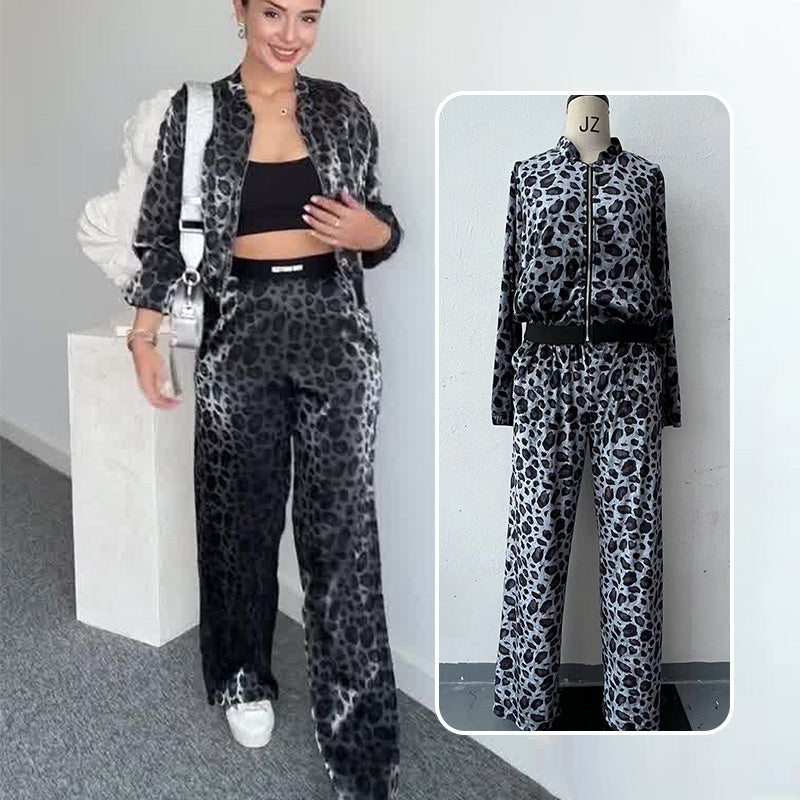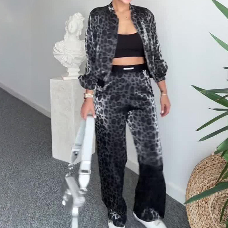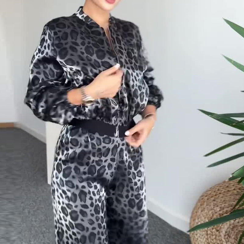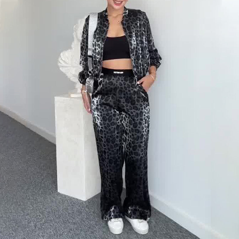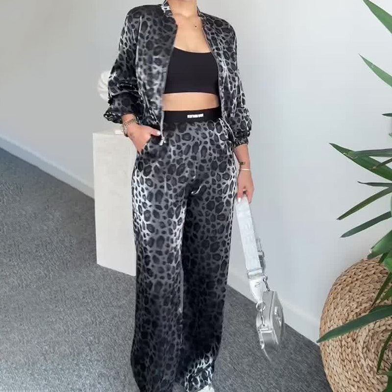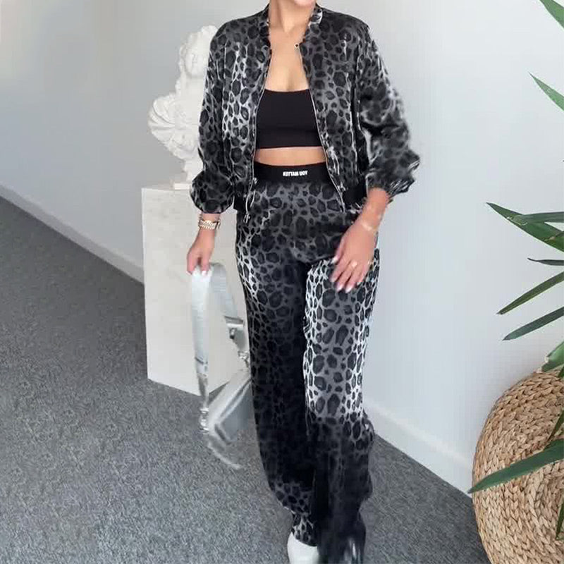 Women's Fashion Leopard 2-Piece Set - Full-Zipper Jacket & Matching Wide-Leg Pants