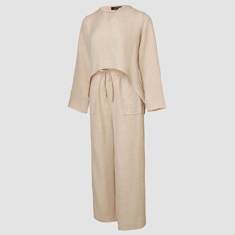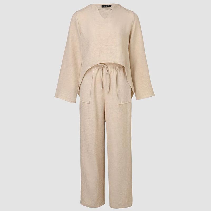 This stylish and comfortable two-piece ensemble combines a unique asymmetric pullover with a relaxed, drawstring-waist pant, creating a look that's both effortless and on-trend.