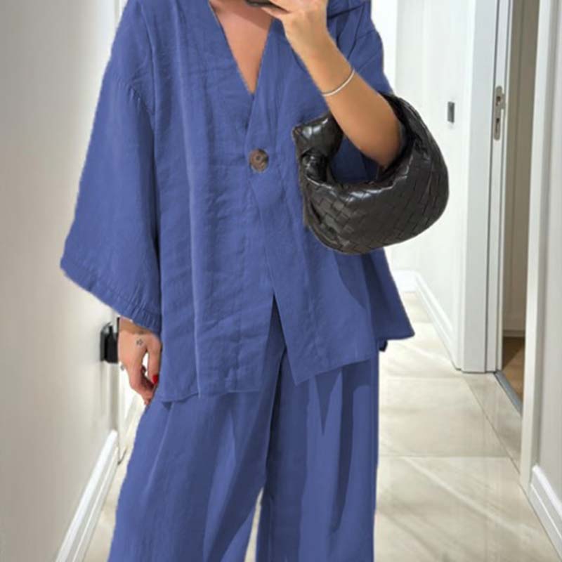 Women's V-Neck Top & Wide-Leg Pants Solid Color 2-Piece Set