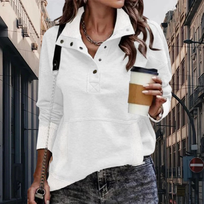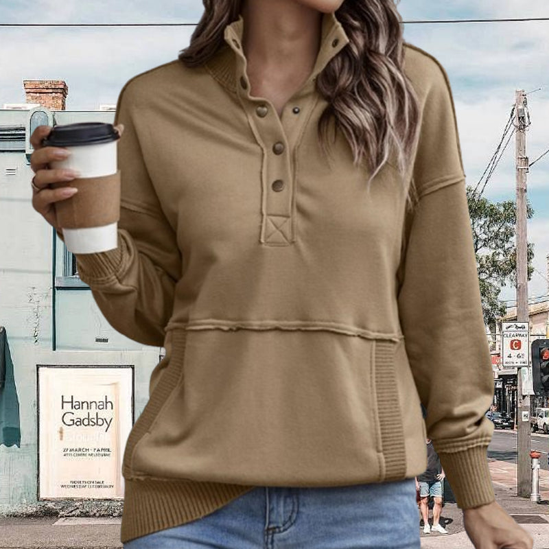 STAND COLLAR WITH SNAP BUTTONS: This cozy pullover features a stylish stand collar with snap buttons, allowing you to adjust the neckline to your preference.