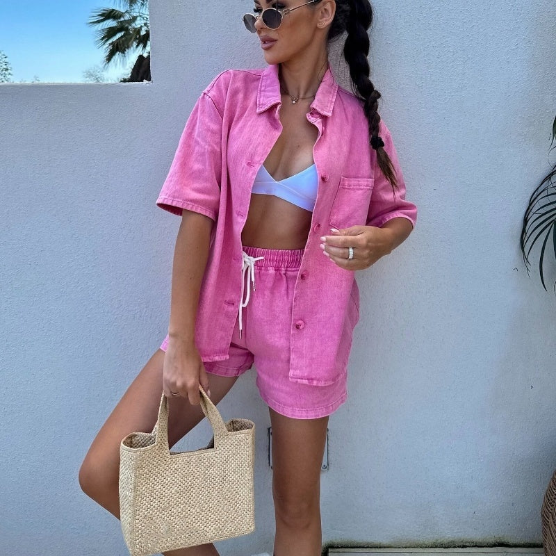 Women's Fashion Denim Lapel Top and Shorts Set