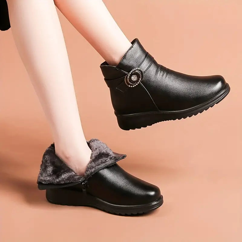 Women's, One-colour, Winter, Leather Platform Boots With Snow