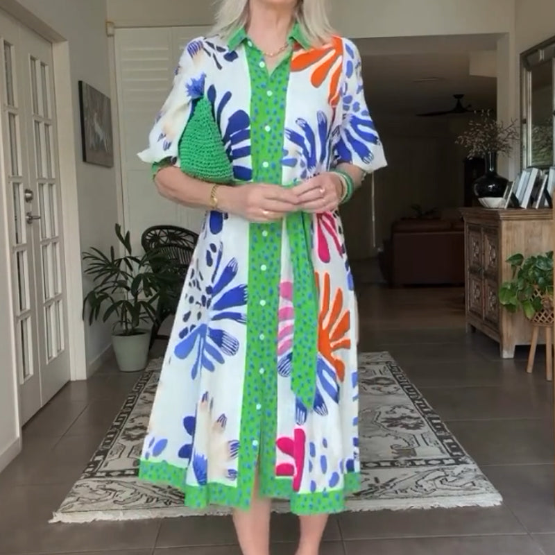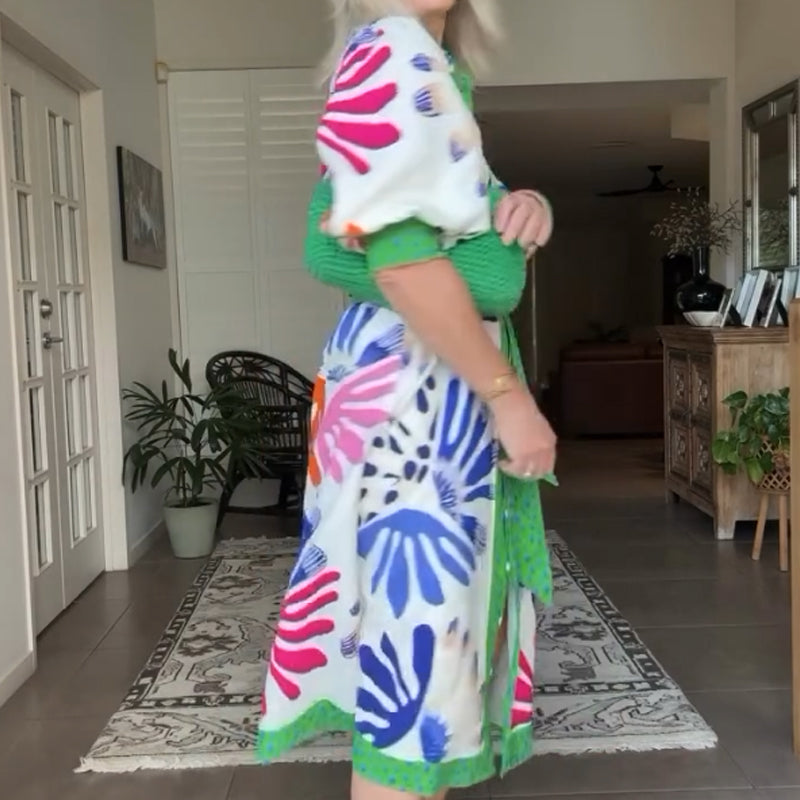ELEGANT FLORAL PRINT:Features a sophisticated floral pattern in refreshing green tones that creates a feminine, nature-inspired aesthetic. The artistic design transitions beautifully from daytime garden parties to evening events with simple accessory changes.