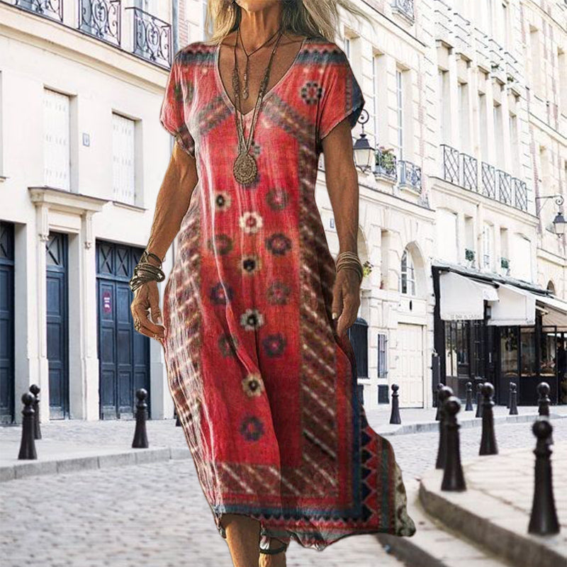 Women's Printed V-Neck Short-Sleeve Long Dress