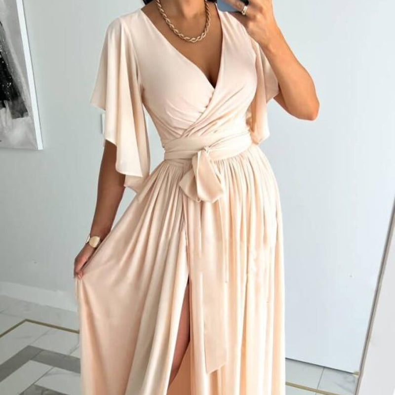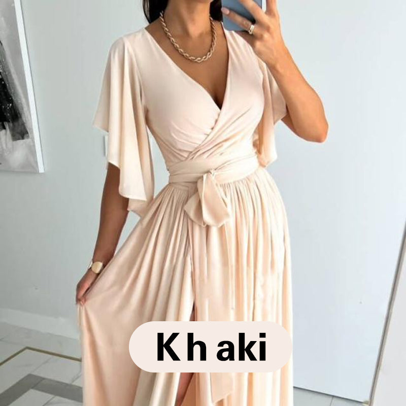 This dress combines elegance, femininity, and a touch of drama to create a head-turning look. Featuring ruffle sleeves, a surplice neckline, a high split, and a matching belt, this dress is perfect for special occasions, parties, or evening events.